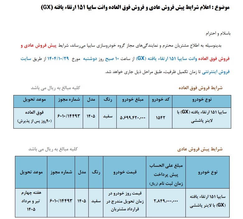 به گزارش اول فارس بر اساس اعلام شرکت سایپا ، فروش فوقالعاده و پیشفروش عادی وانت سایپا۱۵۱ ارتقاءیافته (GX) از ساعت ۱۰ صبح روز دوشنبه ۲۹ دیماه ۱۴۰۴ آغاز و تا تکمیل ظرفیت ادامه خواهد داشت.