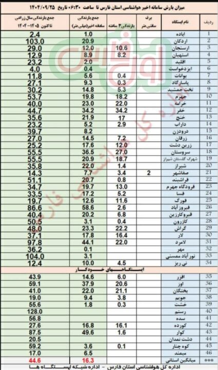 آمار بارش ها در استان فارس تا ساعتت ۶:۳۰ صبح  ۲۵ آذر ۱۴۰۴