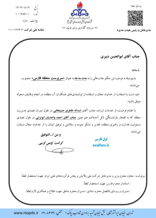 بدینوسیله به موجب این حکم بمدت سه ماه بعنوان سرپرست منطقه فارس منصوب می شوید.