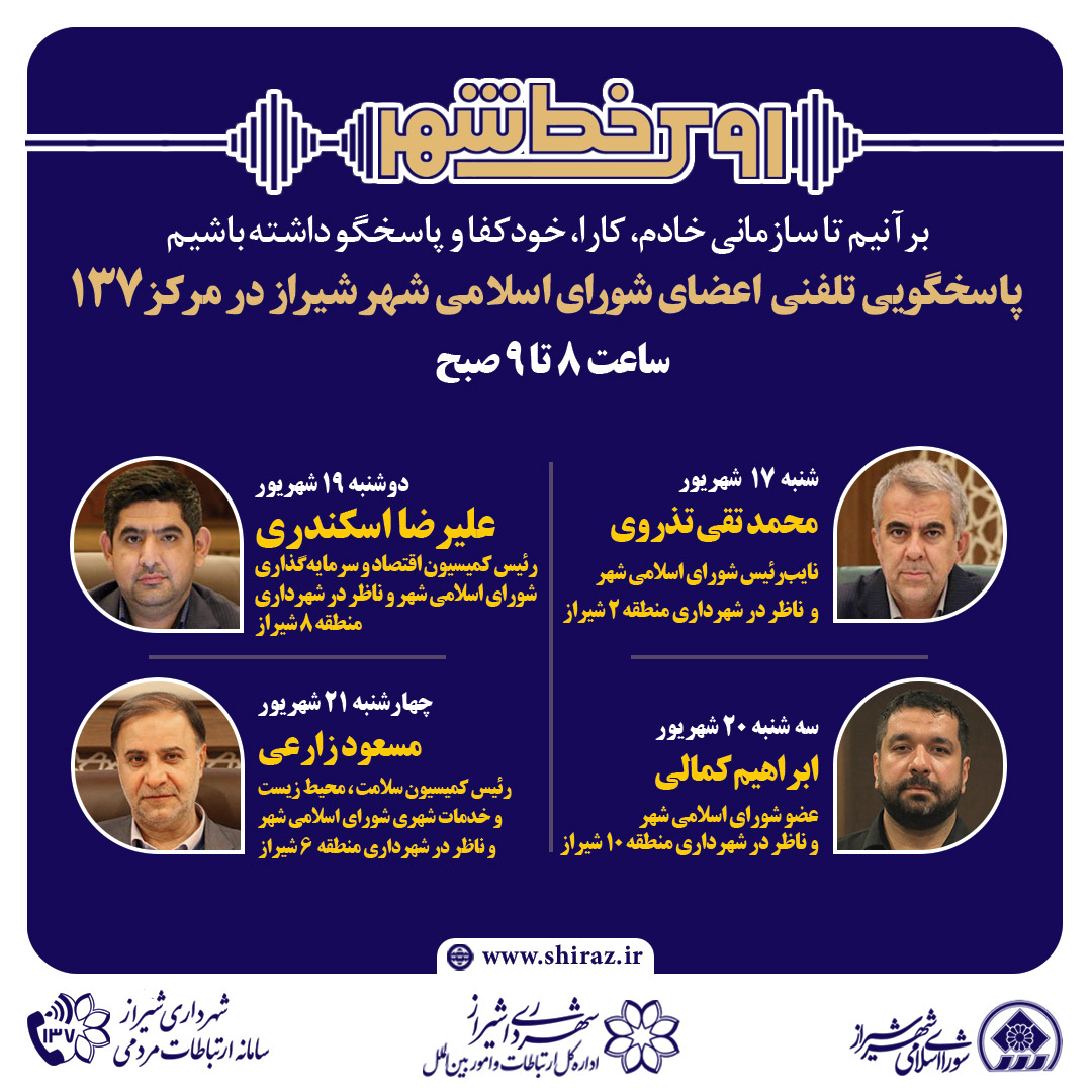در ادامه پاسخگویی تلفنی اعضای شورای اسلامی شهر شیراز به مسائل مردمی؛ علیرضا اسکندری رئیس کمیسیون اقتصاد و سرمایهگذاری شورای اسلامی شهر و ناظر در شهرداری منطقه ۸ شیراز، ابراهیم کمالی عضو شورا و ناظر در شهرداری منطقه ۱۰ و مسعود زارعی رئیس کمیسیون سلامت، محیط زیست و خدمات شهری شورای اسلامی و ناظر در شهرداری منطقه ۶ شهرداری به ترتیب در روزهای دوشنبه، سهشنبه و چهارشنبه در تاریخ های ۱۹، ۲۰ و ۲۱ شهریورماه از ساعت ۸ تا ۹ صبح پاسخگوی شهروندان خواهد بود.