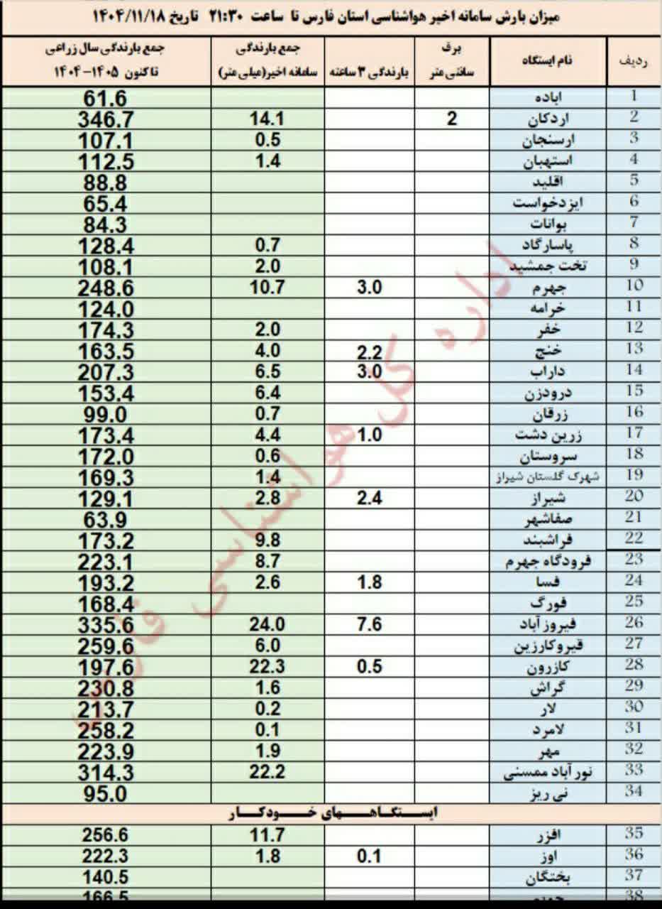 جدول میزان بارش باران در ایستگاه های هواشناسی استان فارس تا ساعت ۲۱:۳۰ امروز۱۴۰۴/۱۱/۱۸ اعلام شد.