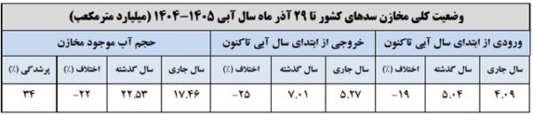 با این حال براساس آخرین آمار اعلام شده میزان ورودی مخازن کل کشور از ابتدای سال آبی (ابتدای مهرماه) تا ۲۹ آذرماه معادل ۴.۰۹ میلیارد متر مکعب بوده که در قیاس با سال گذشته که عددی معادل ۵.۰۴ میلیارد مترمکعب بوده ۱۹ درصد کاهش داشته است.