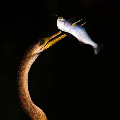 ۱۱. طلا و نقره، فابیان مِکل، آلمان، پرنده آنهینگا با ماهی شکارشده در نور غروب پانتانال.