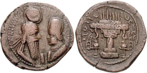 طرحی از سکهٔ دستهٔ سوم اردشیر بابکان؛ شمایل اردشیر و پسرش شاپور بر روی سکه؛ نمایی از آذرگاهی افروخته بر پشت سکه