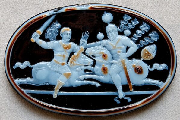 مُهر رومی والرین و شاپور یکم در کابینه مدال‌های پاریس که بر سنگ باباغوری دارای رگ‌های سرخ (عقیق یمانی) کنده‌کاری شده‌است.