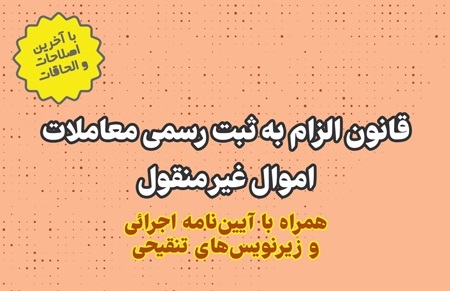 قانون الزام به ثبت رسمی معاملات اموال غیر منقول مصوب ۱۴۰۱/۹/۶ مجلس شورای اسلامی و ۱۴۰۳/۲/۲۶ مجمع تشخیص مصلحت نظام از قوانین مهم ثبتی تازه تصویب میباشد. البته قانون حاضر در اجرا نیازمند آیینهای اجرایی میباشد که در خود قانون پیش بینی شده است. کتابچه جیبی قانون الزام به ثبت رسمی معاملات اموال غیرمنقول متن قانون را همراه با آییننامه تصویب شده تا کنون را بدقت گردآوری کرده است.