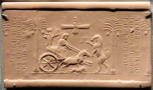 مُهر داریوش بزرگ سوار بر ارابه جنگی درحال شکار شیر با متن: